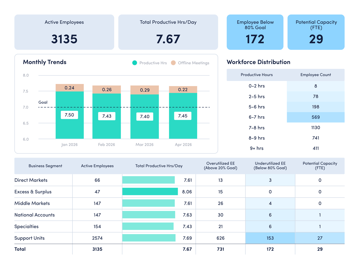 Analyze productivity trends on employee focus, engagement and utilization to make data-informed decisions on resource allocation.