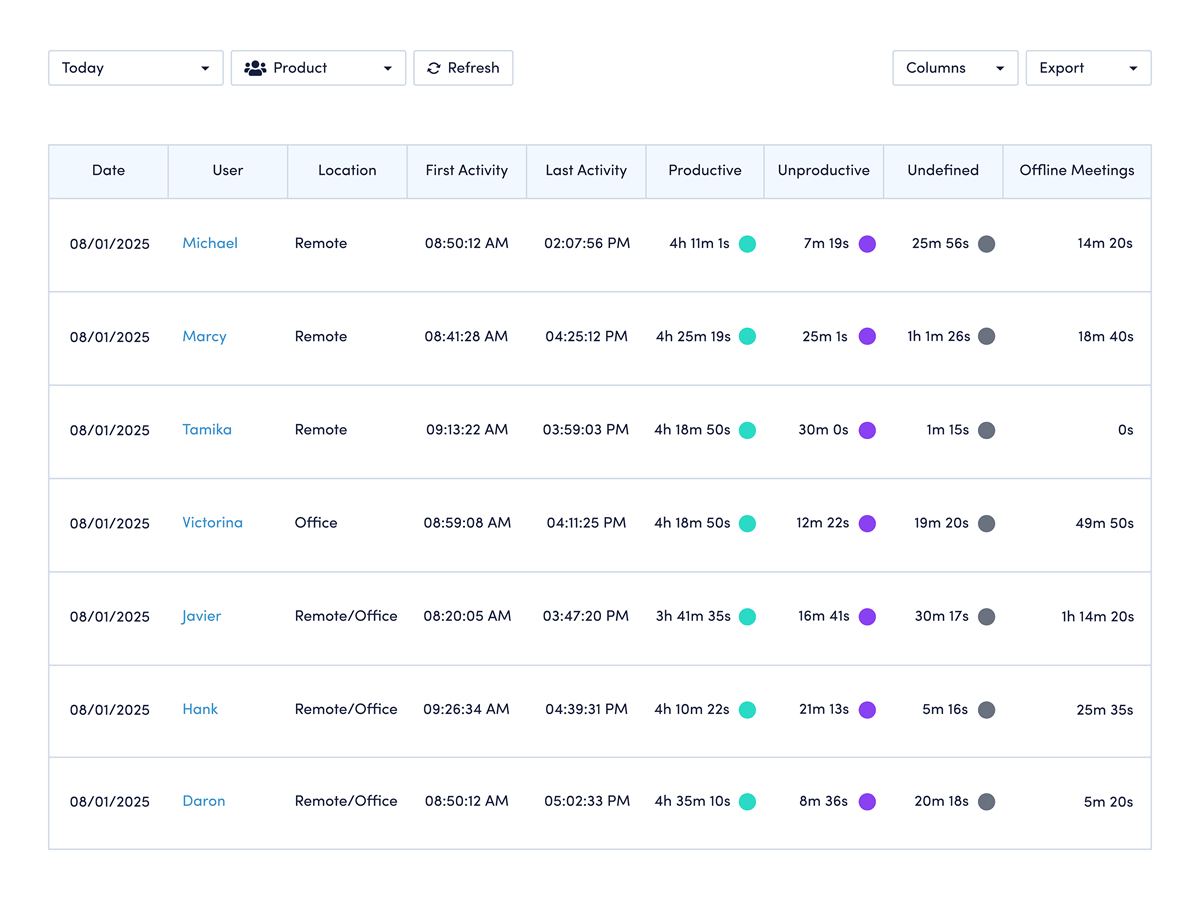 These reports not only measure productivity but also provide important insights. Some highlight distractions or areas where people might need more support to stay focused. Others show you if teams are more productive when they’re in the office or working from home. Productivity reports also help highlight training needs, identify top performers and reveal employee engagement levels. This data-driven approach helps foster a culture of accountability, where employees are more aware of their contributions to the team and the organization as a whole.