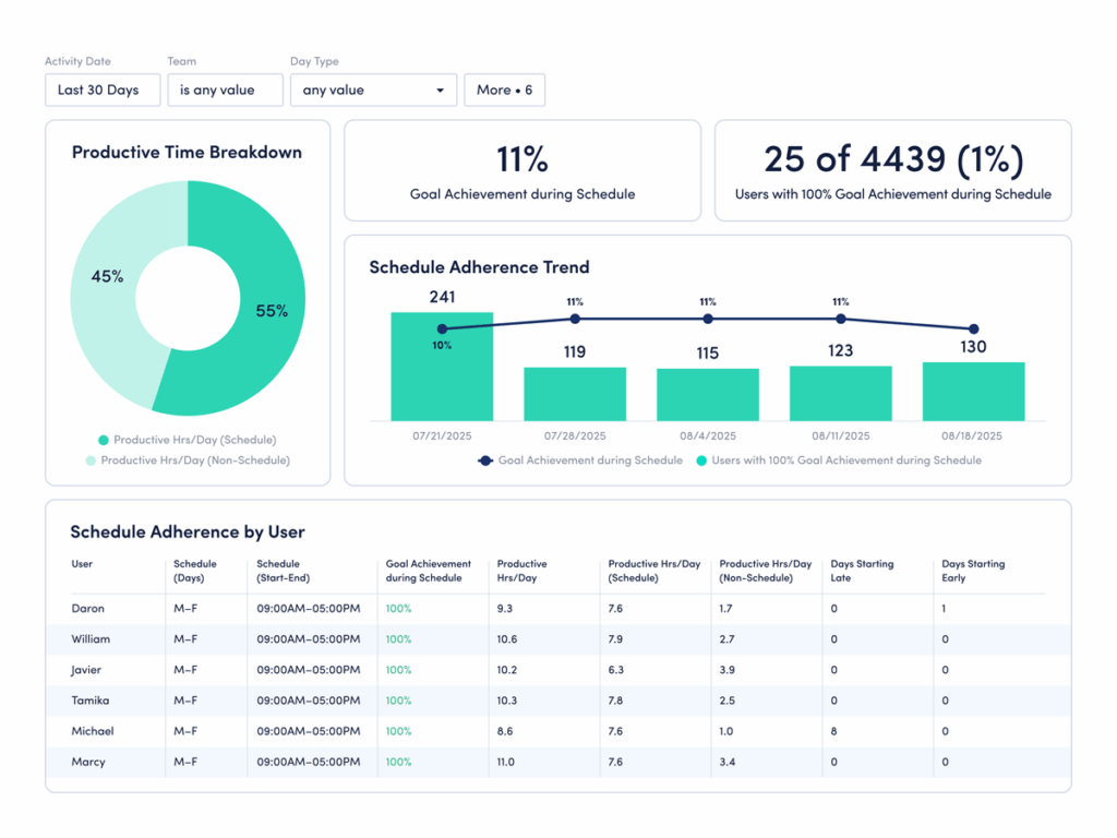 ActivTrak’s Schedule Adherence report monitors how well employees follow assigned schedules and policies. It shows if teams are present during business-critical windows and whether gaps in coverage create downstream impact.