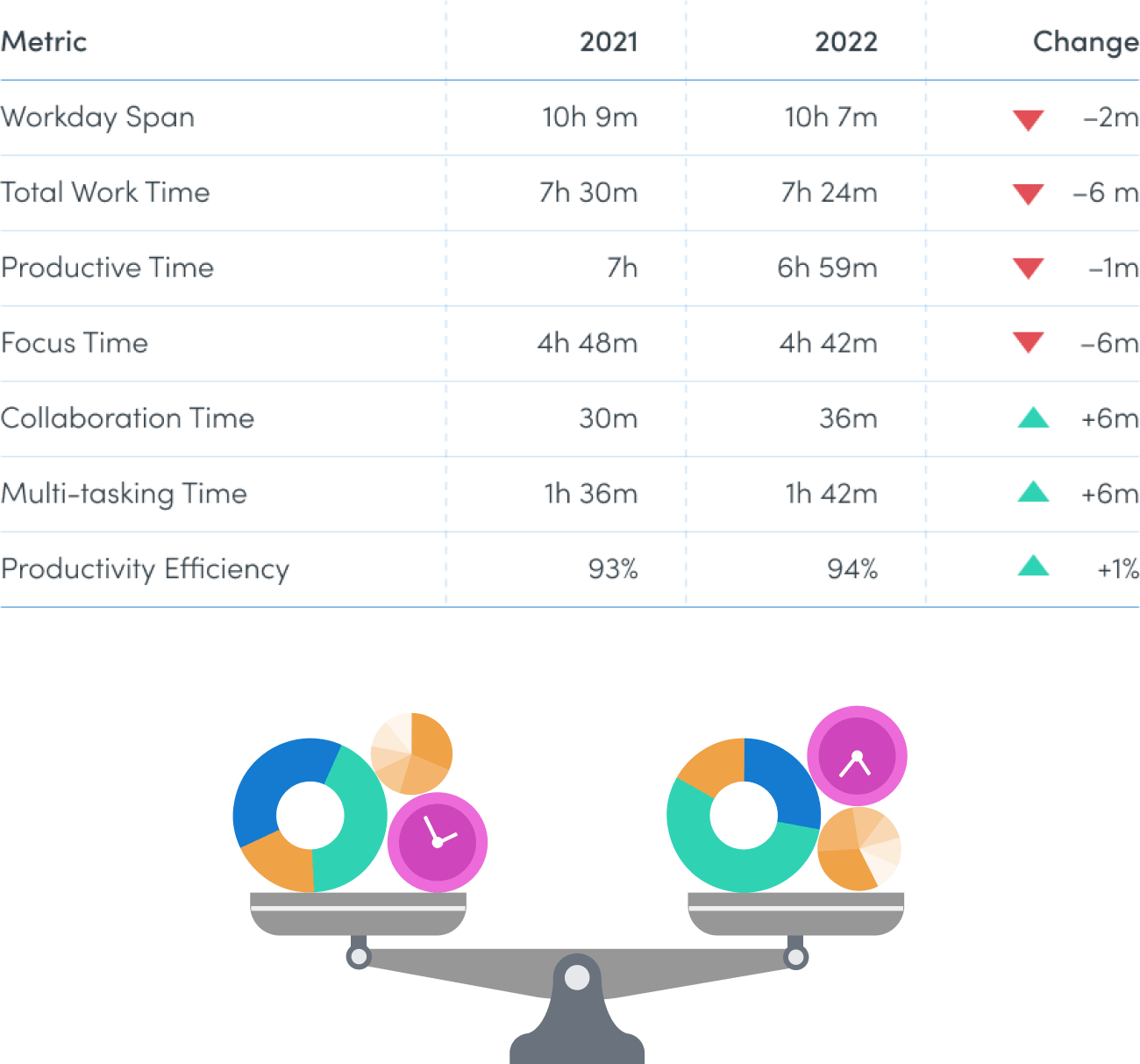 - Employees are more efficient and productive: The average workday is 36 mins (7%) shorter but 2% more productive