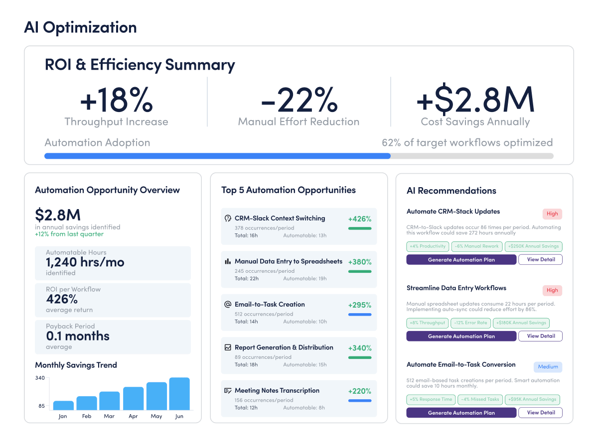 Understand how work happens across your organization. Analyze work patterns across teams, roles and tools to see where time goes, where friction exists and where performance can improve.