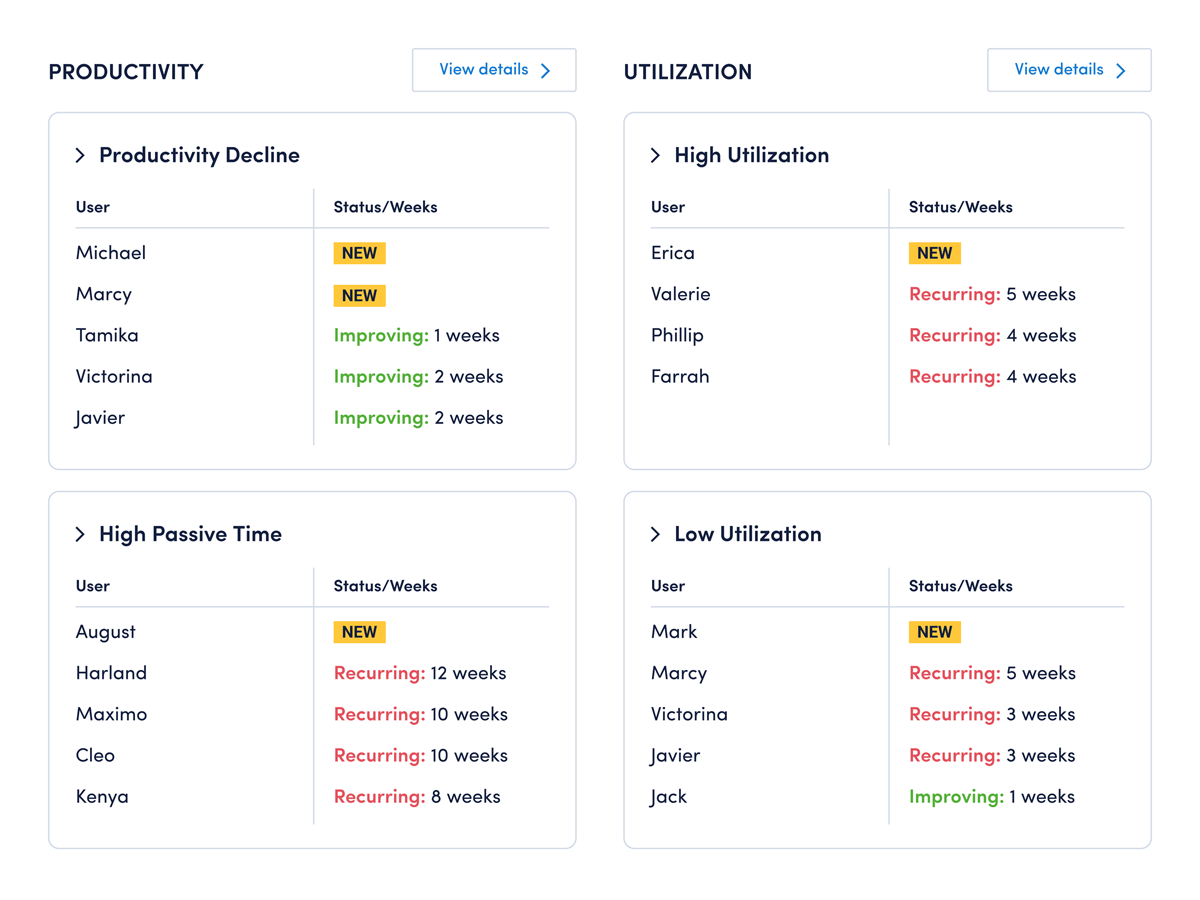 Analyze productivity trends on employee focus, engagement and utilization to make data-informed decisions on resource allocation.